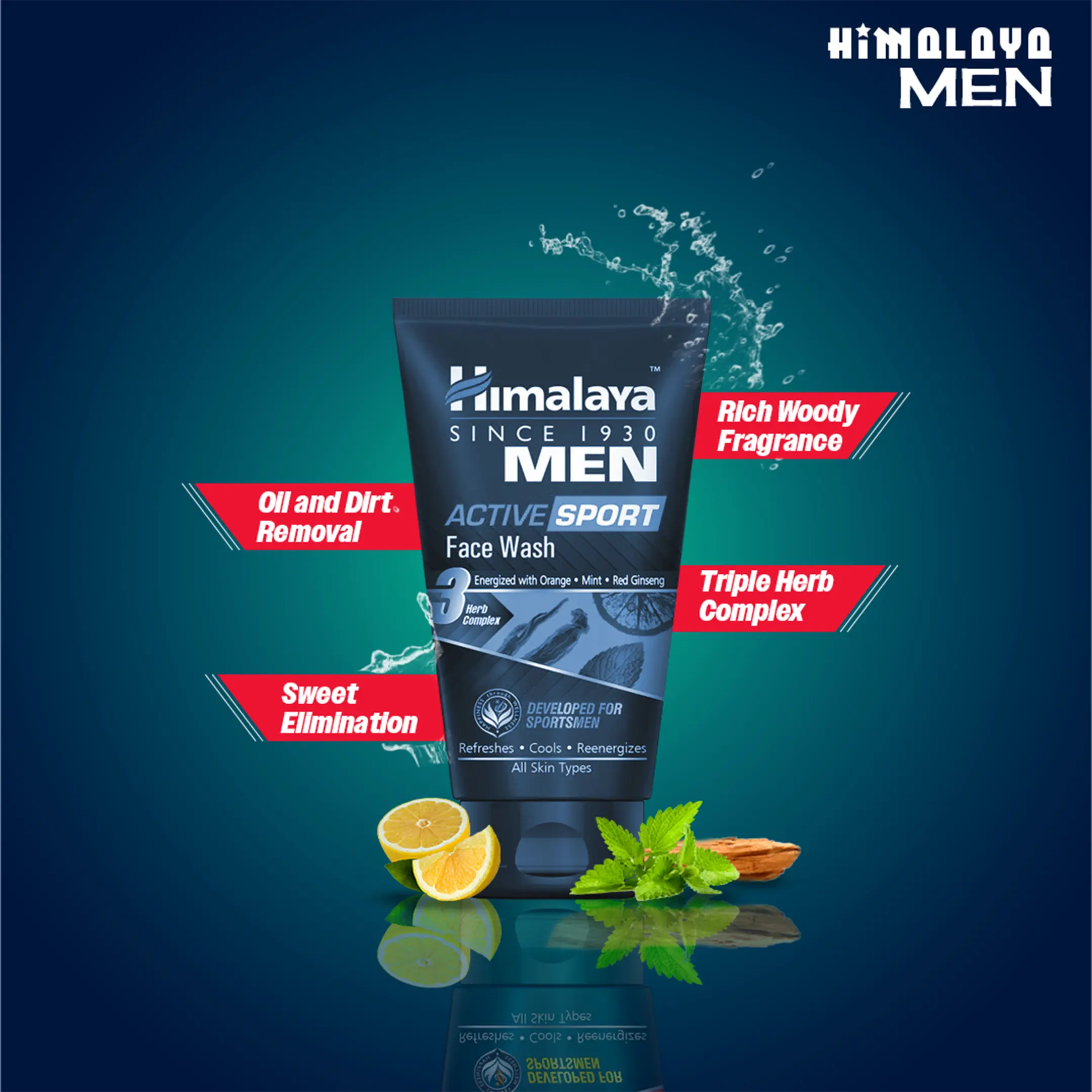 This poster promotes a men's facial cleanser product. The design focuses on freshness and performance using water splashes, citrus elements, and cool color tones. The layout highlights key product benefits such as oil removal and skin freshness while keeping the product as the central focus.