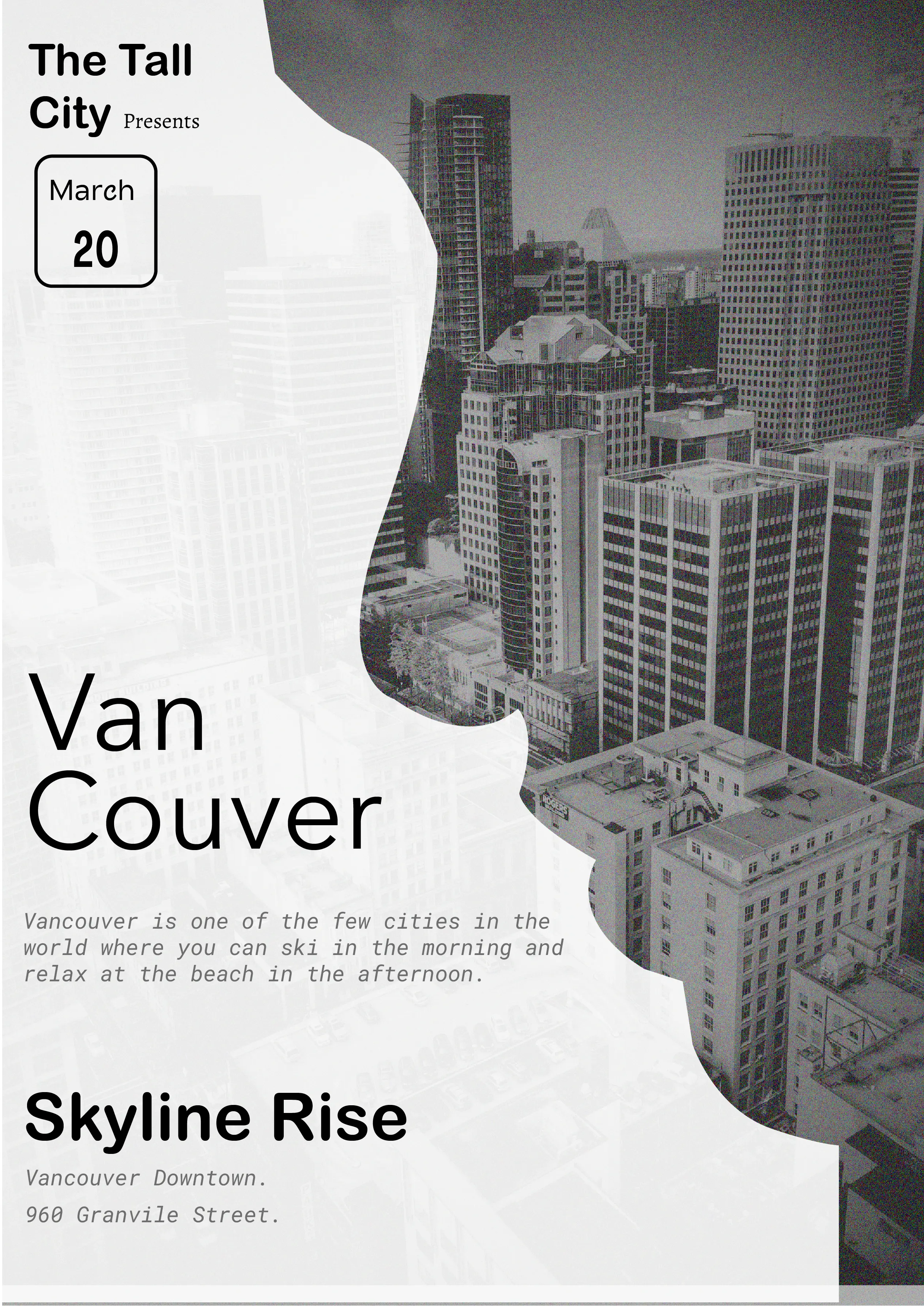 This event poster promotes a fictional city event in Vancouver. A minimal layout combined with a grayscale skyline image creates a modern and clean visual style. The flowing shape helps guide the viewer’s eye through the information while keeping the focus on the city atmosphere.