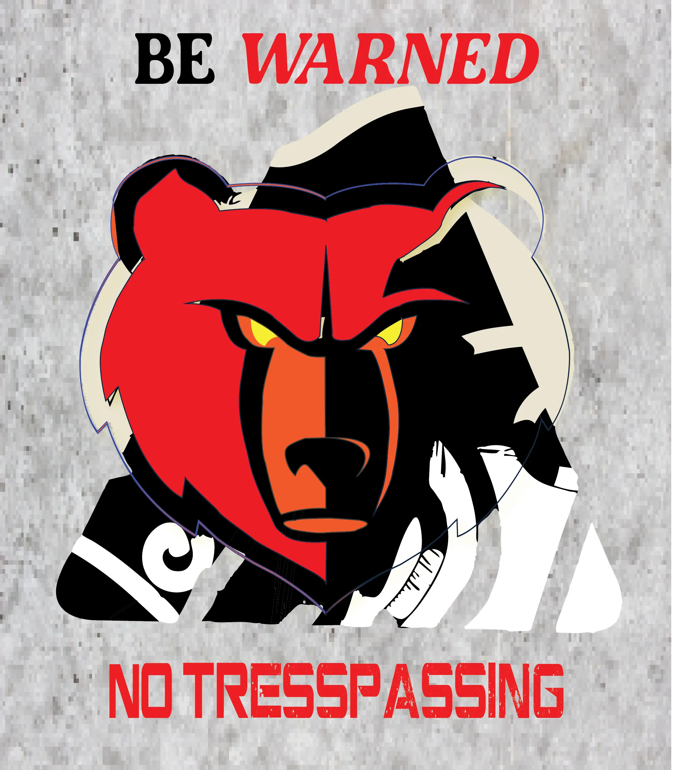 This poster was designed as a warning sign for protected wildlife areas. The aggressive bear illustration combined with bold red typography creates a sense of danger and urgency.